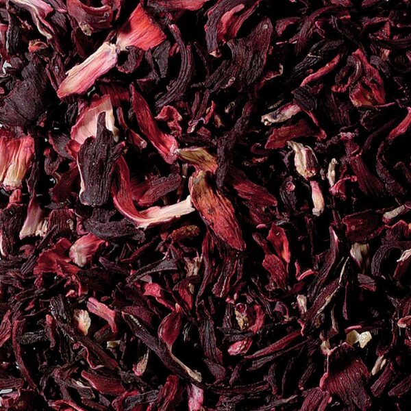 The hibiscus consists of the hibiscus’ calyx and external calyx. They are harvested during the time of the fruits and then dried. The inner calyx is 3 cm long and up to the middle it is ball-like. Above there are five upward bent tips. The external calyx consists of 10 small, slim leaves that are strongly “anchored” with the calyx basis. After its flowering time the fleshy and slightly crumbly calyxes take on their typical red colour. The main countries of cultivation of the hibiscus, also known as mallow, are the Sudan, Egypt, Nigeria, China, Mexico and Thailand. The infusion of the hibiscus blossom can either be drunk pure or in form of a fruit tea blend and is thoroughly refreshing. These blossoms are often a major part of fruit teas and give a fresh and succinctly tangy infusion. Depending on the country of origin, the colour and acidity varies. Hence, with fruit tea blends you can determine the degree of acidity and/or colour by trying out different quantities and qualities of hibiscus blossoms.
